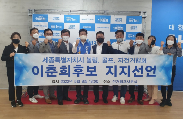 [충청뉴스 최형순 기자] 8일 세종시 골프협회, 세종시 볼링협회, 세종시 자전거협회 등이 이춘희 더불어민주당 세종시장 후보 선거사무소를 방문하여 간담회에 이어 지지 선언을 진행했다.