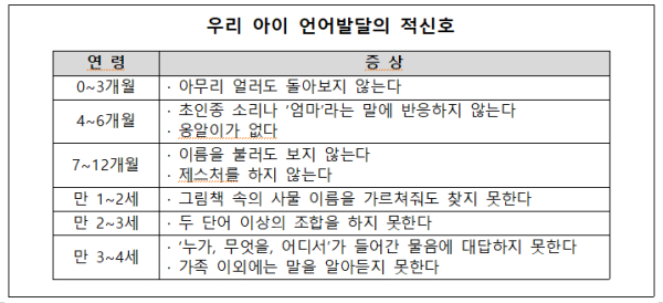 보통의 경우 생후 1~6개월에는 ‘우’, ‘아’ 같은 모음에 가까운 옹알이를 하고, 6~12개월 경에는 ‘맘마’, ‘빠빠’ 등 단숨에 여러 음을 낸다. 돌부터 18개월까지는 완벽히 발음하지 못해도 익숙한 단어의 뜻을 인지하고, 18개월부터 두 돌까지는 두 단어를 결합하거나 간단한 단어로 자기의 감정이나 생각을 표현할 수 있게 된다. 이후 2~3살 경에는 명사와 동사를 결합해 표현하고 이후 3~4개의 단어로 된 문장을 구사하게 되는 것이다.