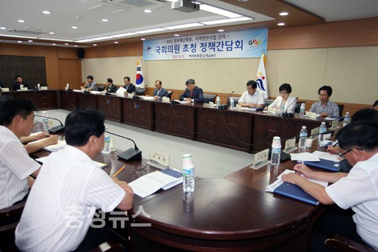 이날 간담회에서 논의된 의제는 ▲청주공항~백제문화단지 철도연장 구축 ▲세종시~금강권역 연결 경전철 조기 추진 ▲백제역사문화도시 조성 사업 재원변경 및 관련법 제정 ▲부여 정림사 복원 추진 ▲4대강사업 기념 금강타워 건립 ▲왕포천 재해위험지구사업 조기 착공 등 지역발전 중장기 현안과제에 대한 참석자들간 열띤 토론이 진행됐다.