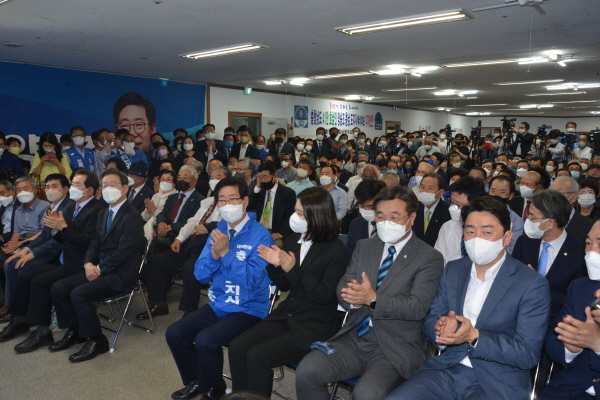 이날 개소식에는 이재명 중앙당 총괄선대위원장, 정세균·이낙연 상임고문(전 국무총리), 윤호중·박지현 공동비대위원장, 강훈식(아산을, 충남도당위원장)·어기구(당진시)·김종민(논산계룡금산)·문진석(천안갑)·이정문(천안병) 의원, 이병학 충남교육감 후보, 이재관 천안시장 후보, 오세현 아산시장 후보, 김대영 계룡시장 후보, 김정섭 공주시장 후보, 김학민 예산군수 후보, 유승광 서천군수 후보, 캠프 본부장으로 내정된 박수현 전 청와대 국민소통수석을 비롯해 충남지역 지방선거 후보자들 및 시민·당원 500여 명이 참석해 대성황을 이뤘다.