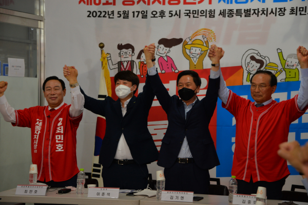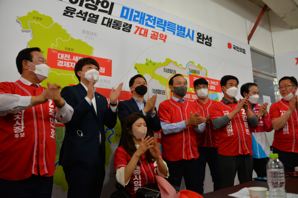 아울러 "당 지도부에 저희가 단언한다. 최민호 후보를 중심으로 한 팀이 되어 똘똘 뭉쳐서 이 패배의식을 승리의 의식으로 바꾸어 놓겠다. 그리고 정말 진정한 의미의 정권교체를 여기서 중심이 돼서 이룩하겠다고 다짐했다.