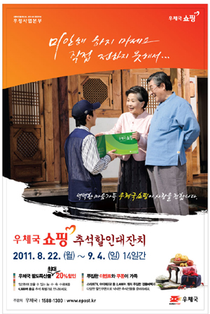 충청지방우정청은 한가위를 맞아 22일부터 오는 9월 4일까지 14일간 ‘우체국쇼핑 추석맞이 할인 대잔치’를 열고 팔도특산물을 최대 20%까지 할인 판매한다고 밝혔다.