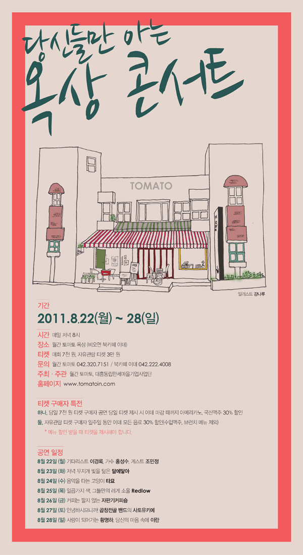 ‘월간 토마토’는 옥상 콘서트가 서울 유명 언더그라운드의 음악을 대전에서 접하고, 분위기를 확인하는 한편 다양한 음악 장르를 접함으로써 대전 시민의 음악에 대한 이해도를 한층 더 끌어올릴 수 있는 즐거운 추억이 될 것으로 기대하고 있다.