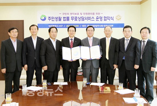 대전 서구(구청장 박환용)는 구민의 권익 보호와 생활민원 편의를 위해 23일 서구청에서 대전·충남지방법무사회 대전광역시지부(지부장 박철훈)와 ‘주민생활법률 무료상담서비스’ 운영을 위한 협약을 체결했다.