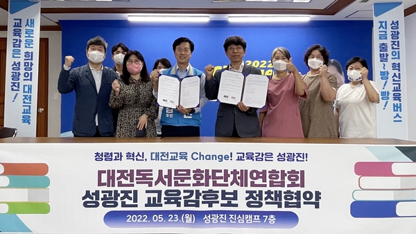 대전독서문화단체연합회와 성 후보는 ▲대전시내 모든 초중고에 최소 1명 이상 사서교사(전문사서) 배치 ▲독서경영 도입 ▲1인 1만 5천 원 독서수당 연 1회 지급 ▲청소년 대상 미디어 리터러시 교육 강화 ▲독서문화 행사 예산 지원 등에 관한 정책협약을 맺었다.