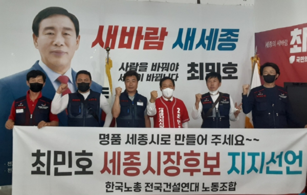 한국노총 전국건설연대노동조합 세종지부는 도영록 대표를 비롯한 조합원들이 참석한 가운데 "명품세종시로 만들어 달라"며 최민호 국민의힘 세종시장 후보 지지 선언식을 가졌다.