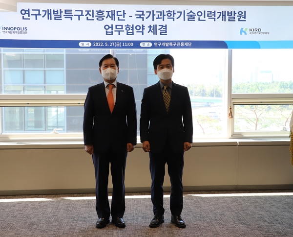과학기술정보통신부(장관 이종호) 산하 공공기관 연구개발특구진흥재단(이하 특구재단)과 국가과학기술인력개발원(이하 KIRD)은 27일 인적자원개발 체계 고도화 및 역량 강화를 위한 업무협약식을 가졌다.