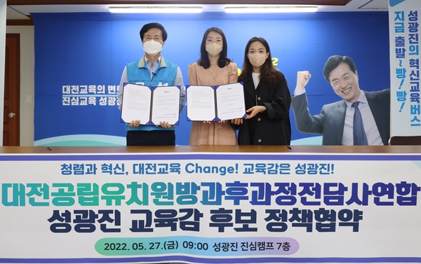 [충청뉴스 이성현 기자] 성광진 대전교육감 후보가 27일 대전공립유치원방과후과정전담사연합과 정책협약을 맺었다.
