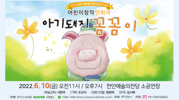 [충청뉴스 박동혁 기자] 천안시립흥타령풍물단의 어린이 창작 연희극 ‘아기돼지 꼼꼼이’가 오는 10일 오전 11시와 오후 7시 천안예술의전당 소공연장에서 개최한다.