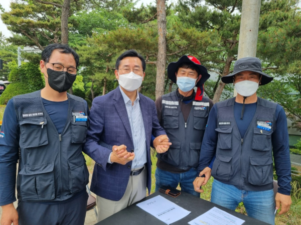 박경귀 당선인(왼쪽 두번째)과 화물연대 관계자들