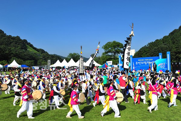 오전 9시 각동 농악팀의 농악과 에어로빅으로 흥겹게 문을 연 구민화합 한마당 행사는 17개 동의 입장 퍼레이드를 시작으로 본격적인 화합행사의 서막을 열었다.