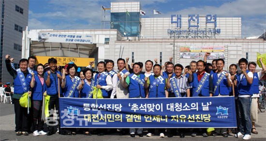 선진당은 이날 오후 3시부터 2시간여 동안 대전역 광장에 집결해 중앙시장을 거쳐 으능정이 거리까지 도보로 이동하며 길가의 휴지를 줍고, 휴일 어지럽혀진 쓰레기더미들을 정리했다.