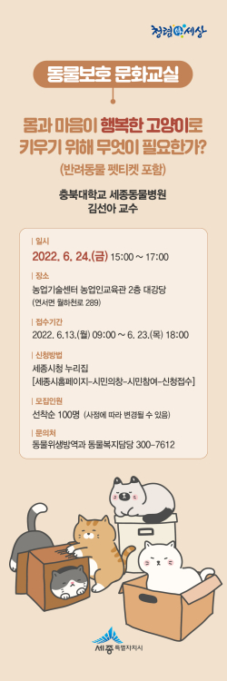 이번 문화교실은 반려동물 행동의학 전문가인 김선아 충북대 세종동물병원 교수를 초청해 진행된다.
