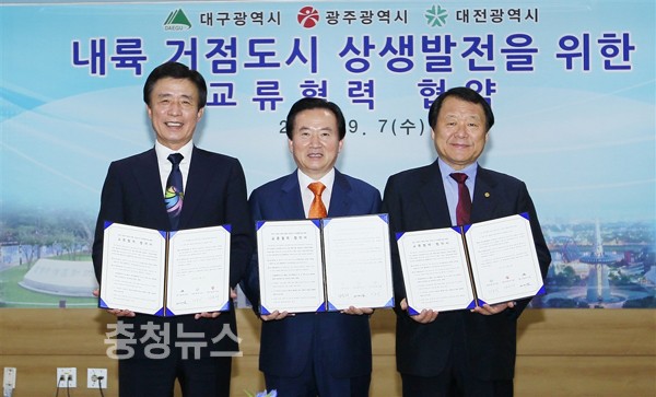 염홍철 대전시장, 김범일 대구시장, 강운태 광주시장은 7일 오후 광주시청에서 ‘내륙 거점도시 상생발전을 위한 업무협약’을 체결하고, 상호 우호증진 및 교류협력을 위한 공동사업을 전개하기로 했다.
