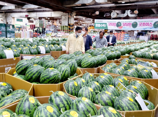 [충청뉴스 최형순 기자] 한국농수산식품유통공사 김춘진 사장은 22일 서울시 송파구 서울가락농수산물도매시장을 찾아 민생경제와 밀접한 주요 농수산물의 가격 및 수급 동향 등 현장 물가를 살펴본 뒤, 최근 가격 상승세가 큰 수박 등 여름 제철 과일류를 집중 점검했다.