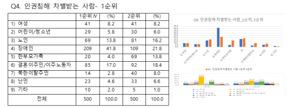 ‘인권침해를 받는다고 생각하는 사람’의 1순위와 2순위로 묻는 질문에서는 장애인(41.8%), 결혼이주민/이주노동자(17.0%), 노인(13.8%), 여성(8.2%) 순으로 나타났고, 2순위 응답에는 장애인(21.8%), 결혼이주민/이주노동자(18.4%), 노인(16.2%), 여성(8.2%)로 나타났다. ‘기타’라고 응답한 경우, 구체적으로 응답한 내용은 군인(0.6%), 남성(0.6%), 성소수자(0.4%) 순으로 나타났으며, 그 외에도 기초생활수급자, 비정규직, 빈민, 서민 등이 각(0.2%)로 나타났다.