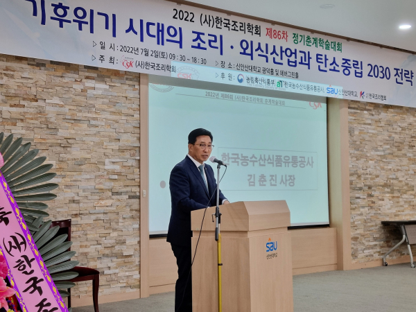 [충청뉴스 최형순 기자] 한국농수산식품유통공사 김춘진 사장은 2일 경기도 안산시 소재 신안산대학교에서 개최한 ‘2022 (사)한국조리학회 제86차 정기 춘계학술대회’에 참석해 축사를 하고, 조리학계 및 업계 관계자들과 학술대회 주제인 ‘기후위기 시대, 조리‧외식산업과 탄소중립 2030 전략’에 대해 심도있게 논의했다.