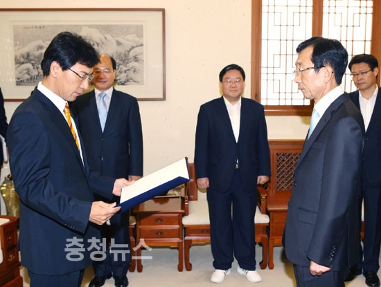 ▲ 안희정 충남도지사로부터 권희태 신임 정무부지사가 임명장을 받고있다.