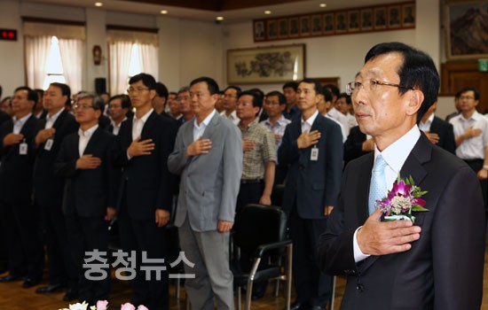 ▲권희태 신임정무부지사를 비롯한 도청공무원들이 국민의례를 하고있다.