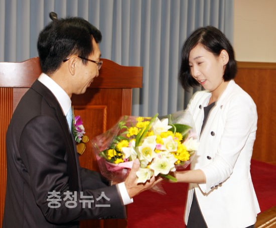 ▲ 가족대표로 권희태 신임정무부지사의 딸이 꽃다발을 전달하고 있다.