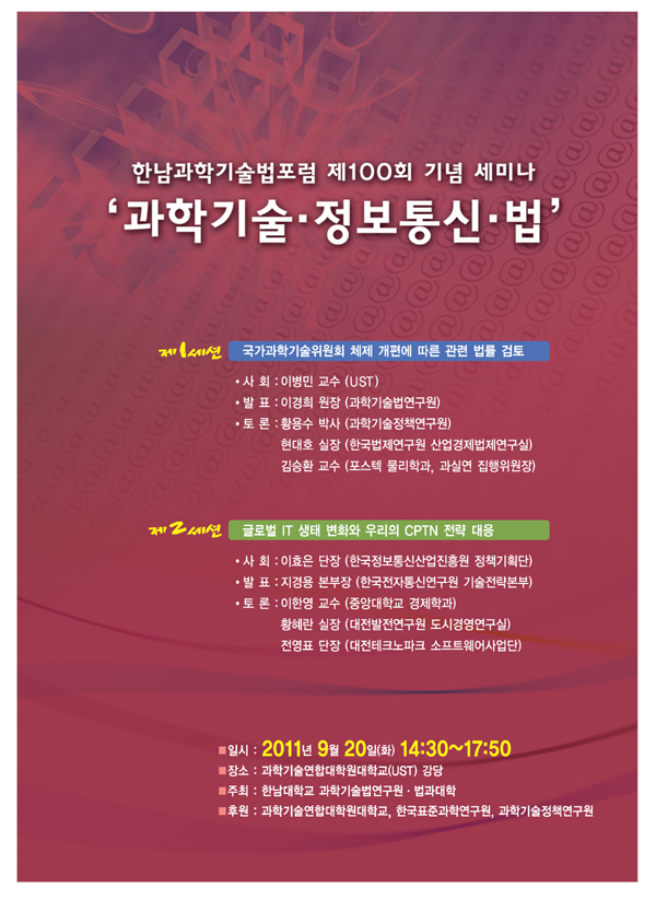 과학기술법연구원, 20일 100회 포럼 UST 강당서 개최