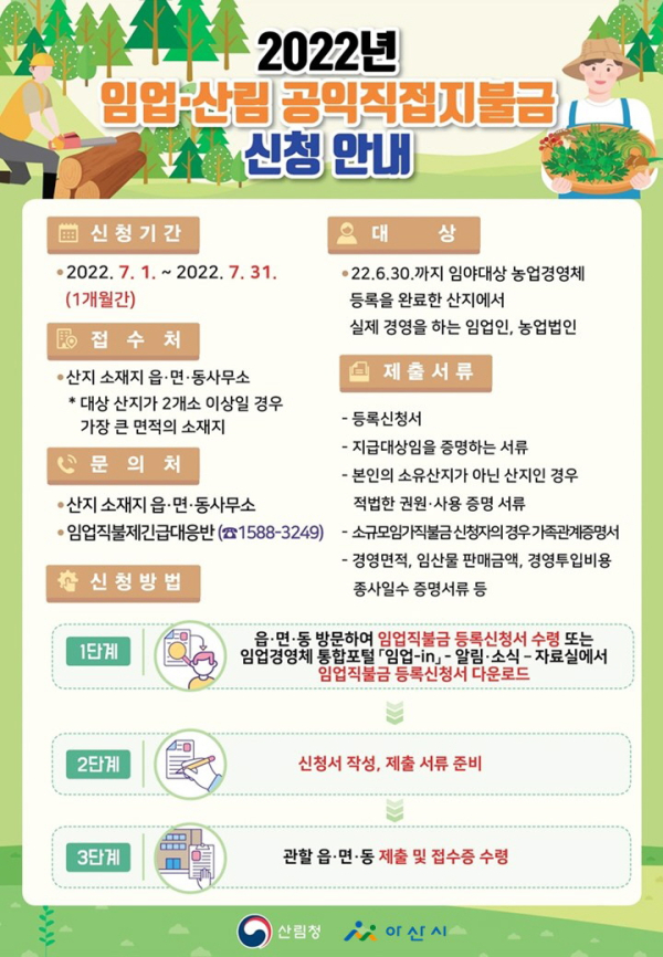 [충청뉴스 최형순 기자] 충남 아산시가 7월 한 달간 ‘2022년 임업·산림공익직접지불제(임업직불금)’ 신청을 받는다.