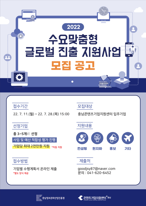 [충청뉴스 박동혁 기자] 충남정보문화산업진흥원(이하 진흥원)이 운영하는 충남콘텐츠기업지원센터(이하 지원센터)에서 입주기업을 대상으로 수요맞춤형 글로벌 진출 지원사업을 추진한다.