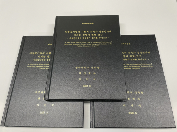 이 과장의 박사학위 논문은 ‘지방공기업의 사회적 가치가 경영성과에 미치는 영향에 관한 연구’라는 주제로 작성됐다.