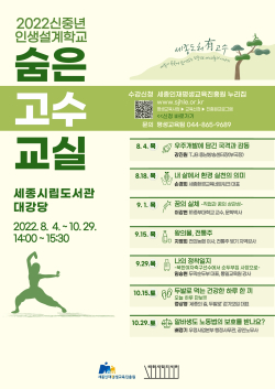 [충청뉴스 최형순 기자] 세종시립도서관과 세종인재평생교육진흥원이 8월부터 10월까지 세종시립도서관 대강당에서 ‘숨은 고수 교실’ 하반기 강좌를 운영한다.