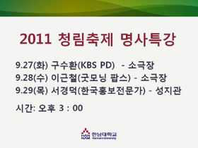 또 하나 눈여겨 볼 내용은 예년 대학축제에서는 보기 힘들었던 ‘명강사 특강’과 ‘북 콘서트’ 등의 문화공연이다. 오는 27일 ‘추적 60분’, 다큐멘터리 ‘울지마 톤즈’ 등으로 유명한 KBS 구수환 PD가 강사로 나서 ‘중심을 잃지 않는 사람’이란 주제로 강의를 진행할 예정이다.