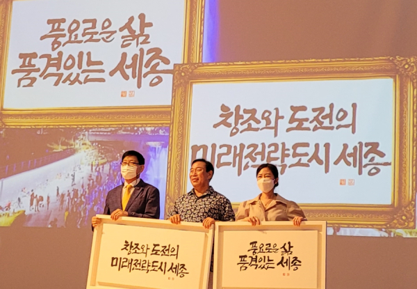 특히, 캘리그라피 작가 김순자 청보리 대표와 세종시기자협의회 최형순 본부장이 '품요로운 삶 품격있는 세종'과 '창조와 도전의 미래전략도시 세종' 액자를 전달해 잔잔한 감동을 주었다.