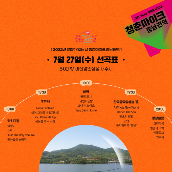 [충청뉴스 박동혁 기자] 충남 아산시와 대전문화예술네트워크협동조합이 오는 27일 ‘2022년 문화가 있는 날 청춘마이크 충남권역’ 공연을 개최한다.
