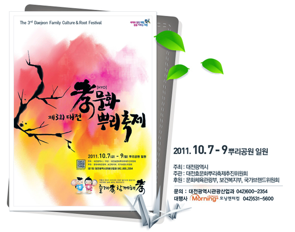 대전시(시장 염홍철)는 오는 10월 7~9일 사흘간 중구 뿌리공원에서 ‘제3회 대전효문화 뿌리축제’를 개최한다고 밝혔다.