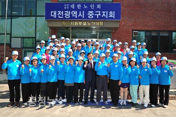 ▲ 박용갑 중구청장이 노인종합체육대회에 참가하는 중구선수단과 기념 촬영.