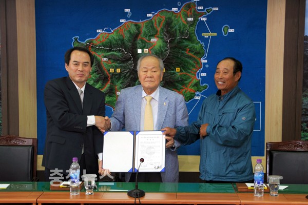 ▲ 계룡장학재단 이인구 이사장이 울릉군청을 방문해 정주민·김성도 부부 후원 약정식을 가졌다.
