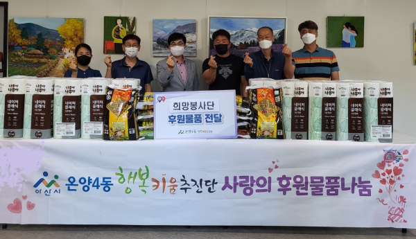이동순 온양4동장은 “후원 물품을 전달해 주신 희망봉사단에 감사드린다”며 “생활이 어려운 저소득 가정에 지속적인 관심을 두고 다양한 복지사업을 통해 적극 지원하겠다”고 밝혔다.