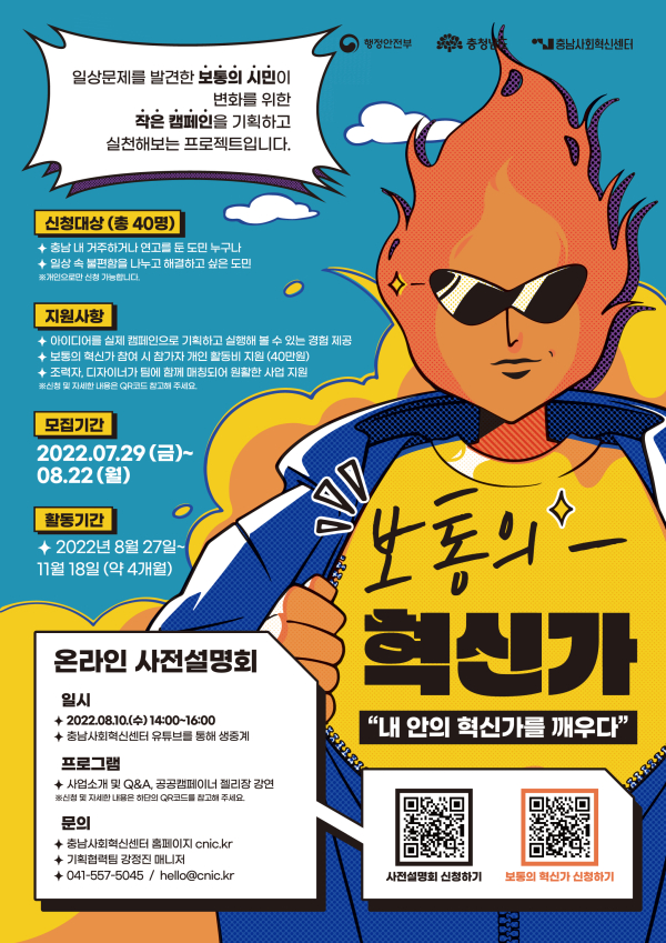 충남사회혁신센터 박주로 센터장은 “일상의 문제를 놓치지 않는 개인들이 늘어나고 함께할 때 우리 사회의 변화가 가능해진다”며 “보통의 시민들이 혁신가로 거듭날 수 있도록 지원을 아끼지 않겠다”고 말했다.