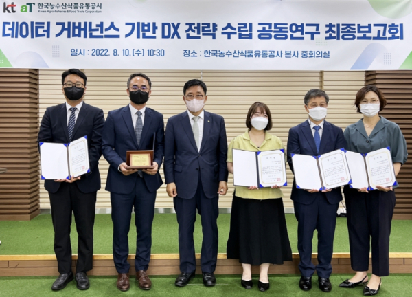 [충청뉴스 최형순 기자] 김춘진 한국농수산식품유통공사 사장은 10일 나주 본사에서 ㈜KT(대표이사 구현모)와 공동으로 ‘데이터 거버넌스 기반 DX 전략 수립 최종보고회’를 개최했다. * DX : Digital Transformation(디지털 혁신)의 약자