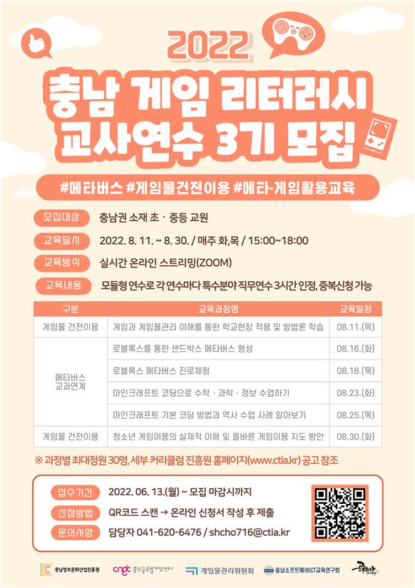 [충청뉴스 박동혁 기자] 충남정보문화산업진흥원이 운영하는 충남글로벌게임센터에서 11일부터 오는 30일까지 충남지역 초‧중등 교사를 대상으로 온라인 게임활용교육 연수를 실시한다.