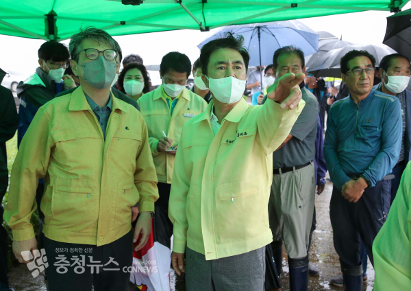 주요 시설 점검을 마친 김 지사는 보령시 주교면으로 이동해 벼 침수 피해지를 살피며 도민의 피해가 최소화 될 수 있도록 빈틈 없는 대응 및 대책 마련을 강조했다.