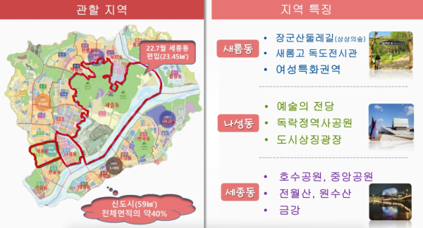 관할 지역은 새롬동 나성동에 이어서 호수공원 중앙공원 전월산 원수산을 포함하고 있는 세종동이 금년 7월에 세롬동에 편입됨에 따라 신도시 전체 면적의 약 40%을 관할 하고 있다.
