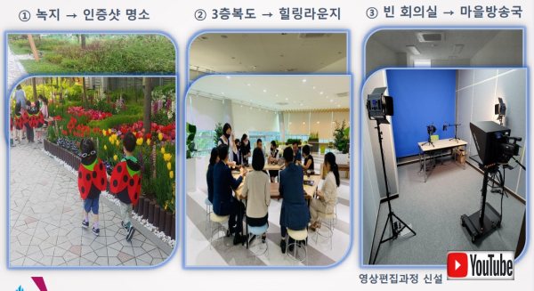 빈 회의실에는 마을 방송국으로 변신해 주민들의 생생한 소식을 유튜브를 통해서 전달을 하고, 1인 미디어 시대에 걸맞게 영상 편집 과정을 신설해 다음 주에 개강을 앞두고 있다.