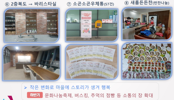 그밖에 2층 복도에 바리스타실 개설, 어려운 이웃의 사연을 적어 소곤소곤 우체통에 넣으면 맞춤형으로 지원해 드리고, 새롬든든찬 나눔 봉사를 통해 따뜻한 복지를 실천해 나가고 있다.