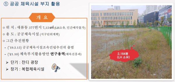 주요 현안은 첫 번째, 공공체육시설 부지 활용이다. 주민들은 단기에는 잔디 광장, 그리고 장기에는 복합 체육시설이 건립되기를 희망하는 것으로 나타났다.
