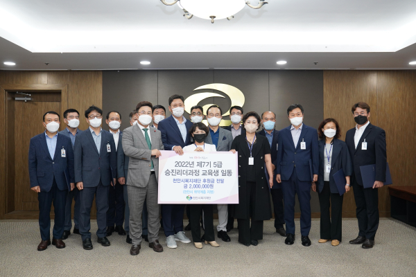 천안시정과 천안시민의 복지발전을 위해 노고와 성과를 인정받은 2022년 제7기 5급 승진리더과정 교육생 17명은 십시일반으로 후원금을 모아 지역사회 취약계층을 위해 기부했다.