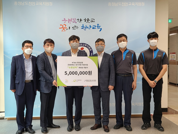 [충청뉴스 박동혁 기자] 충청남도천안교육지원청은 17일 KT&G 천안공장으로부터 지역 내 위기가정을 위한 소망상자 제작 후원금 5백만원을 전달받았다.