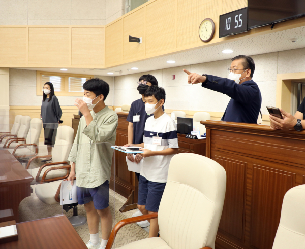 유인호 의회운영위원장은 아동청소년의회 의원들에게 지방의회의 역할과 기능뿐 아니라 본회의장 구조 및 본회의 진행 과정 등에 대해 상세히 설명하고 의회청사 내부를 소개했다.