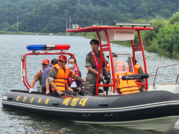 구조용 보트 시승을 하는 박상돈 천안시장과 전우회 관계자들/박동혁 기자
