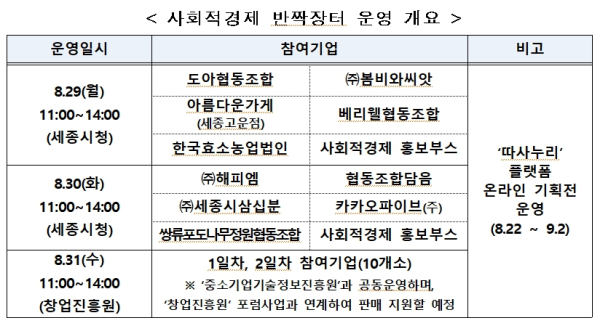 오프라인으로는 오는 29일부터 30일까지 이틀간 세종시청 1층에서, 31일은 창업진흥원 2층에서 매일 11시부터 14시까지 3시간 동안 ‘사회적경제 반짝장터’가 운영된다.
