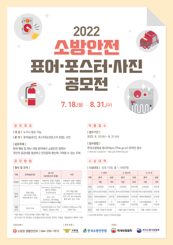 또한, 분야별 동상, 은상, 금상, 대상 등을 선정해 소방시설협회장, 화재보험협회장, 한국소방안전원장, 소방청장 상장 15점과 1,140만원 규모의 시상금을 수여한다.